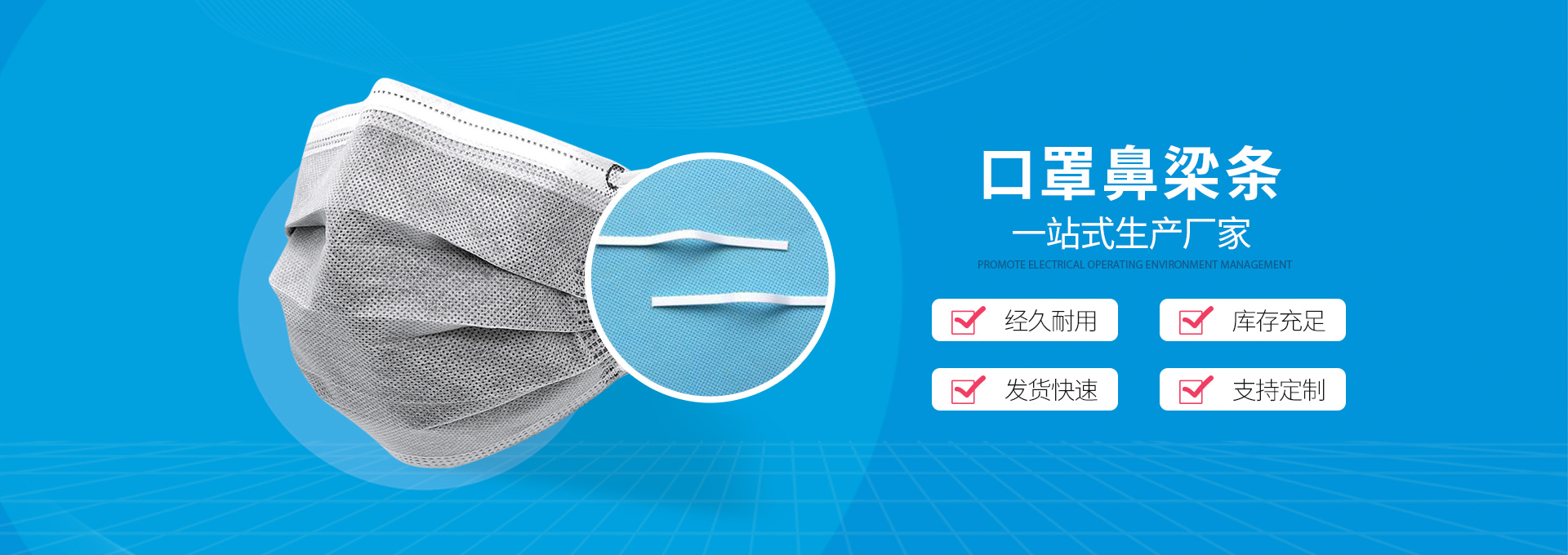 單芯鼻梁條通常只有一根鍍鋅鐵絲,主要起著固定作用,其余部分均是PP或PE材質(zhì)構(gòu)成。它的常用規(guī)格有(2.5-3.0)mm*0.5mm。由于結(jié)構(gòu)簡(jiǎn)...